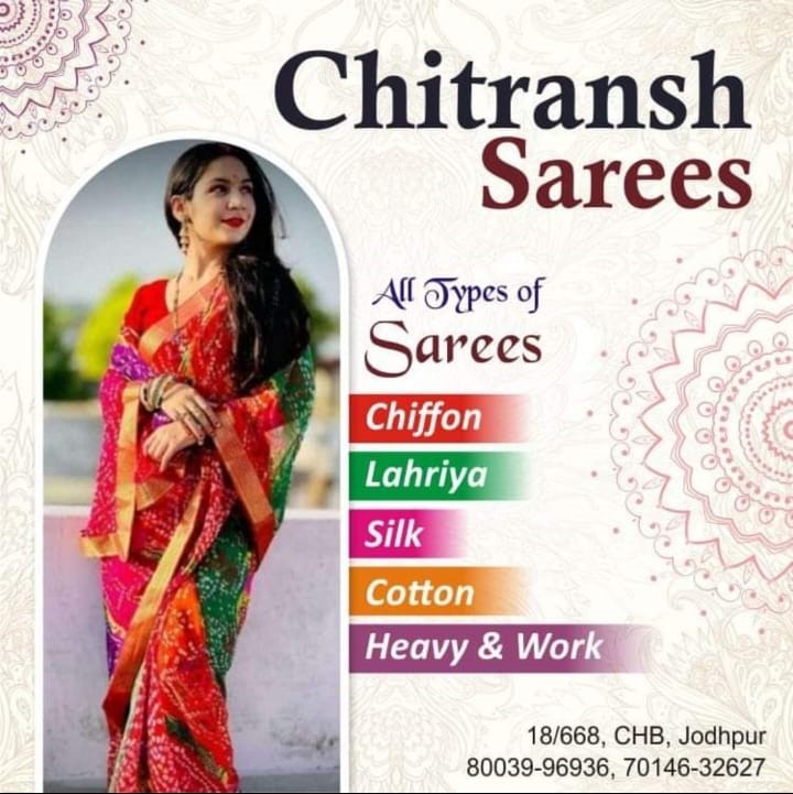 Best Saree shop in Jodhpur-If you are visiting or staying in Jodhpur(Rajasthan) and you want to purchase Jodhpur Sari .Than you can visit “Chitransh Saree” shop which is located in Chopasni Housing Board. This Shop run by Mr Sachin and his wife from his house which is located in Chopasni Housing Board colony .They also get orders from other cities including Jodhpur. In Chitransh sarees you can find a variety of sarees which majorly includes sarees of Silk,Cotton, Bhandaj Lehriya.Jodhpur’s Bhandej Sari is very famous if you get a chance to buy a saree then go to Jodhpur and Buy a Bhandej Saree . Lehriya are very famous in Jodhpur and ladies normally wear “Lehriya” saree during “Sawan” very famous festival season of India. So friends for what we are waiting for ? -Lets go and visit Chitransh Sarees in Chopsani Housing Board and do lot of Shopping from Chitransh Sarees Jodhpur.